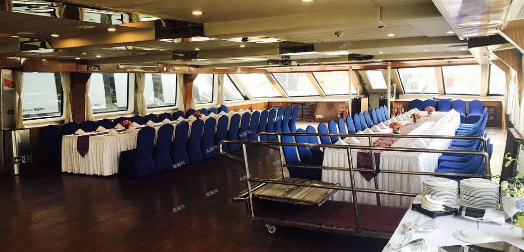 2010年8月全新豪華游輪,船體共3層,1、2層為艙室,3層為陽光甲板。長43米,寬6.8米。采用全新西式設計,整體設計風格通透華麗,非常適合100-200人左右的商務宴請。